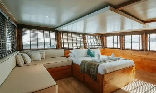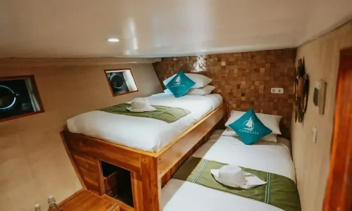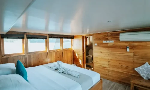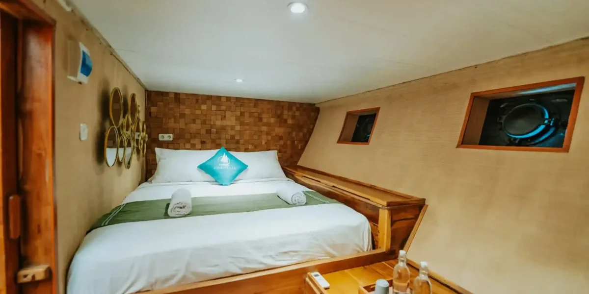 When you charter the Coredelia Phinisi, you’re not just getting a boat you’re securing a complete experience. The boat features five guest cabins, each equipped with air conditioning and ensuite bathrooms, ensuring a comfortable stay throughout your boat. Onboard, you’ll find a spacious dining area, both indoor and outdoor, and plenty of relaxation options, including a sun deck, kayak, and stand-up paddleboard. Entertainment is also a priority, with a TV unit, Bluetooth sound system, and a karaoke lounge. The boat is equipped with all the essentials you need, including life jackets, snorkeling gear, and water dispensers, allowing you to enjoy the natural beauty of Komodo Island without a care in the world. Whether you’re diving, dining, or simply soaking up the views, the Coredelia Phinisi has everything to make your adventure smooth and enjoyable.