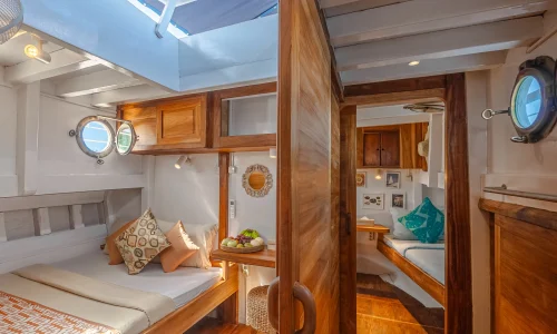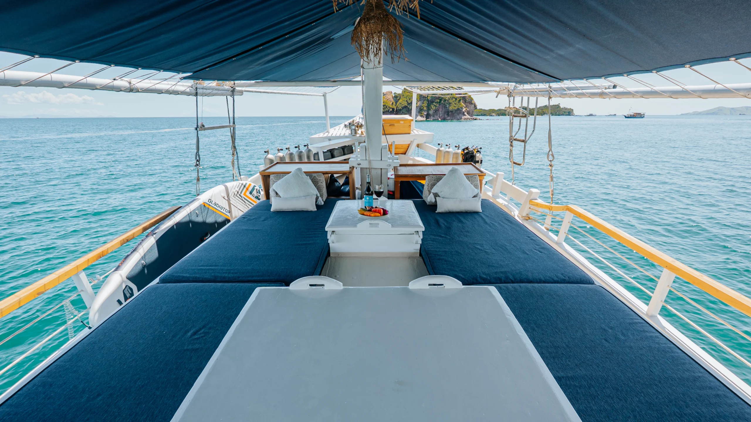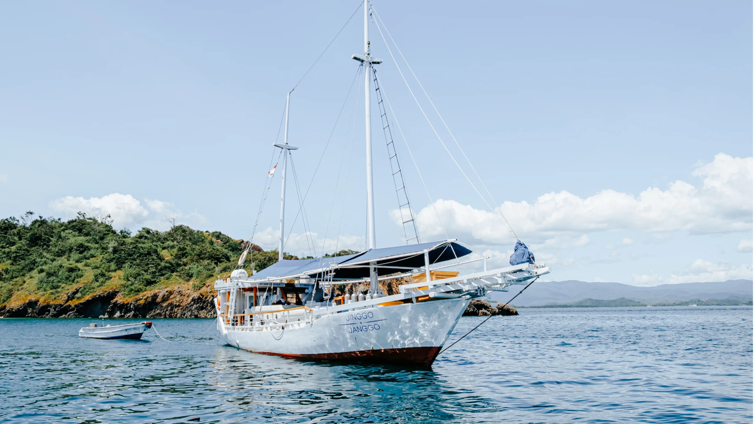The Jinggo Janggo Phinisi presents a perfect choice for a family cruise or lovely honeymooners amidst the breathtaking beauty of Indonesia. This vessel boasts a deck space perfect for resting in between engaging activities.