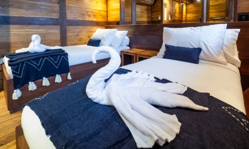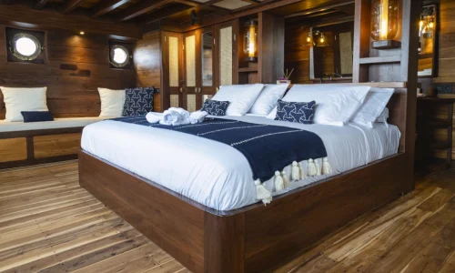 Majik ensures a premier yacht cruise experience with its elegant facilities. The yacht features four spacious cabins: a Master Deluxe Cabin at the aft, a Master Cabin at the front, and two Deluxe Cabins mid-ship. Built from durable iron wood and teak, this 42-meter yacht combines strength and style. With powerful Yanmar and Doosan engines, it can produce 5000 liters of freshwater daily for a smooth phinisi. Dining options include an open kitchen and bar, along with both outdoor and indoor dining areas, perfect for savoring meals and breathtaking views. Majik Phinisi promises an exceptional yacht cruise, blending elegance and adventure as you explore Indonesia’s beautiful waters.