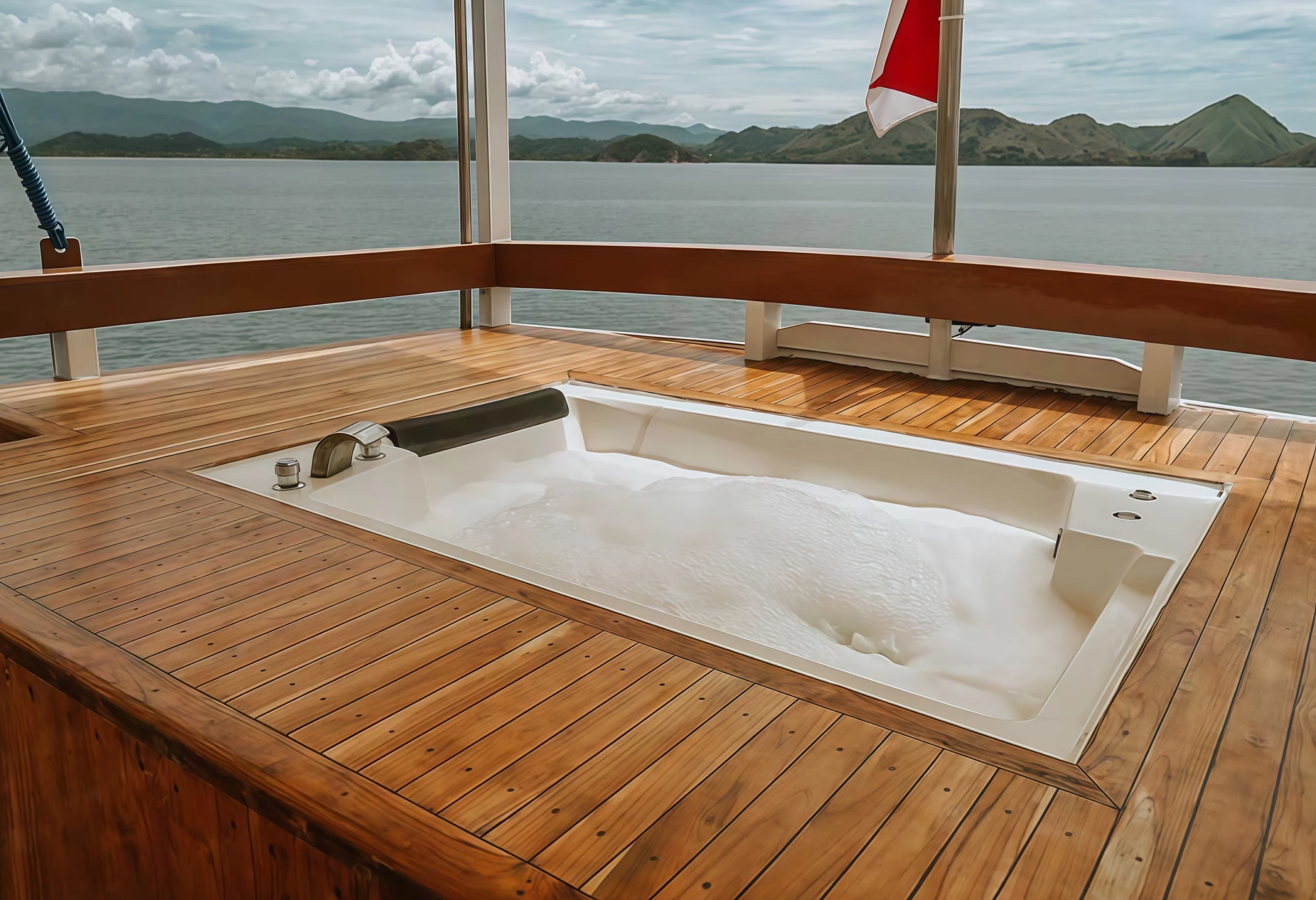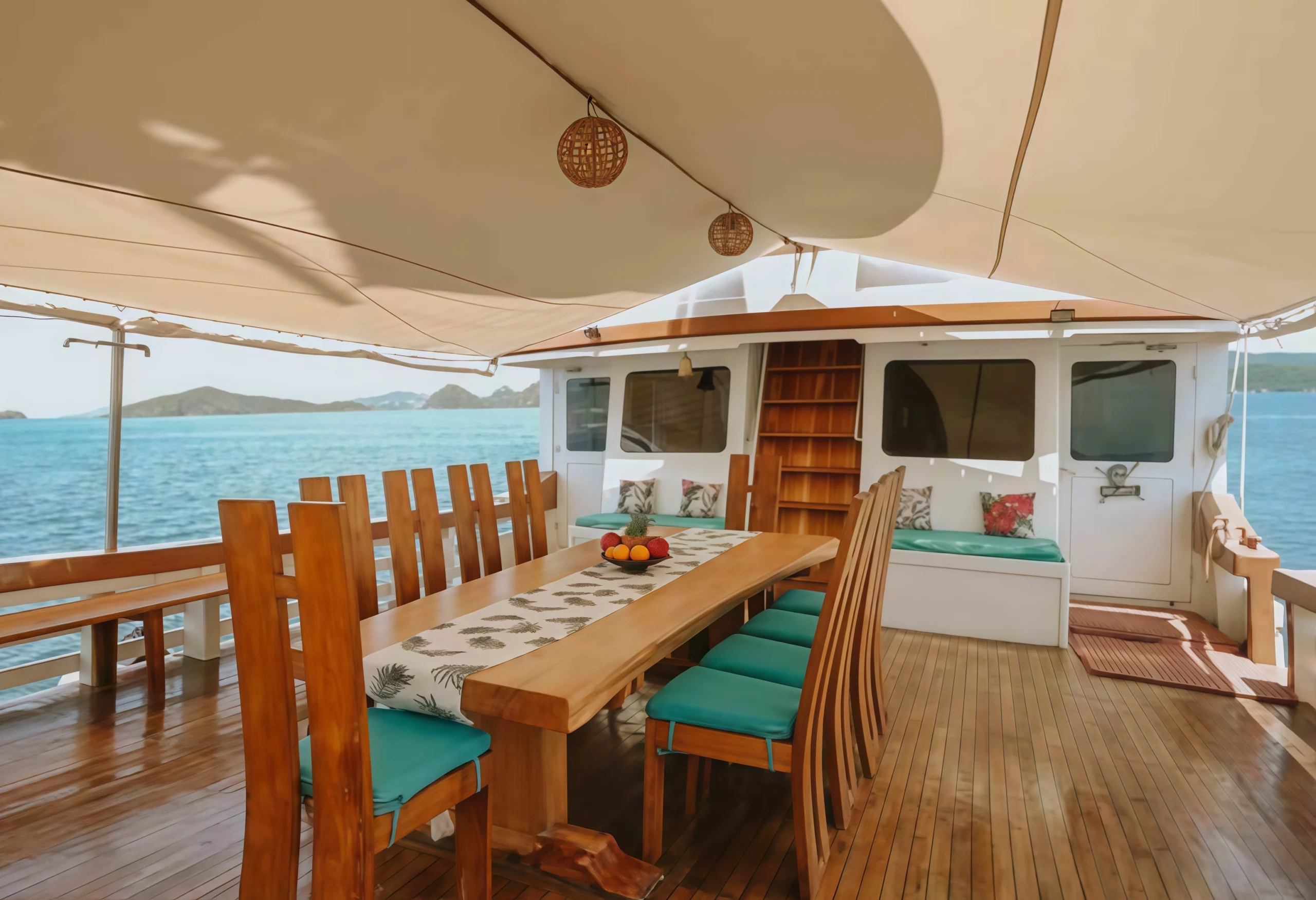 Public areas include a spacious outdoor dining area and a sundeck complete with a Jacuzzi, chaise lounges, and bean bags for relaxing. A dive platform facilitates diving and snorkeling. To complete the experience, passengers can also enjoy a special BBQ dinner on board.