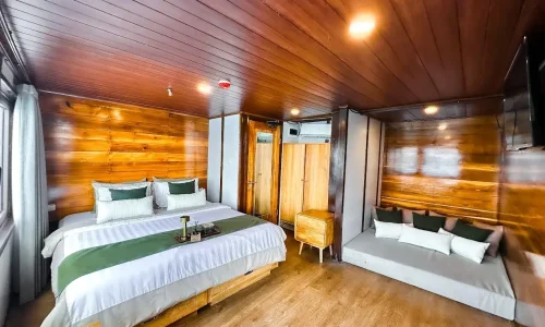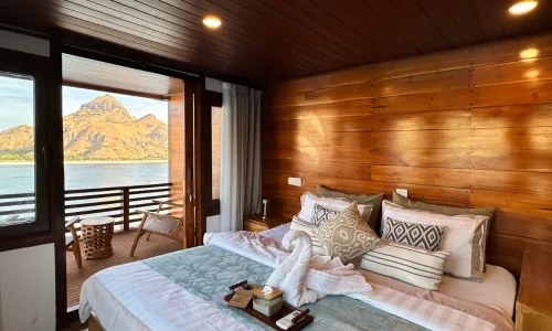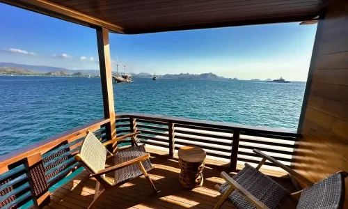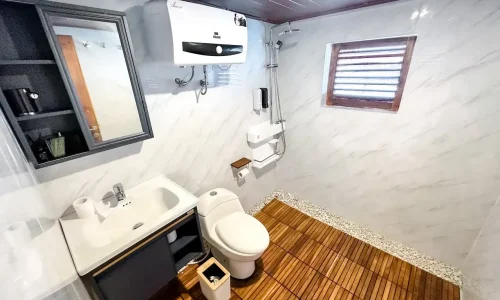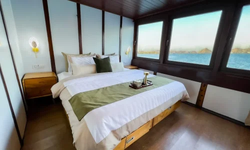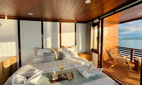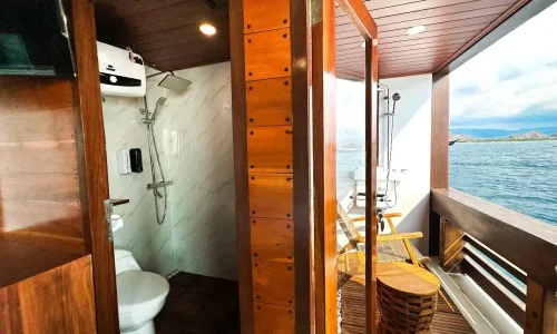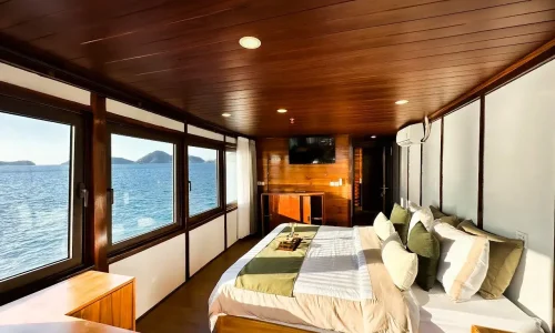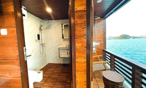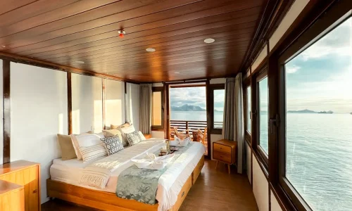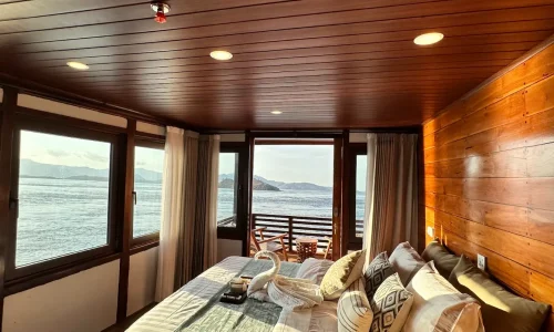 Neptune Phinisi has 7 luxury cabins that feature air conditioning and en-suite bathrooms, ensuring a comfortable stay. Each cabin offers stunning ocean views from private balconies, ensuring every guest can indulge in the serene beauty of the seascape. Onboard facilities include a dining area, karaoke, dive deck, and sundeck for panoramic ocean views, complemented by unlimited free Satellite Internet access.