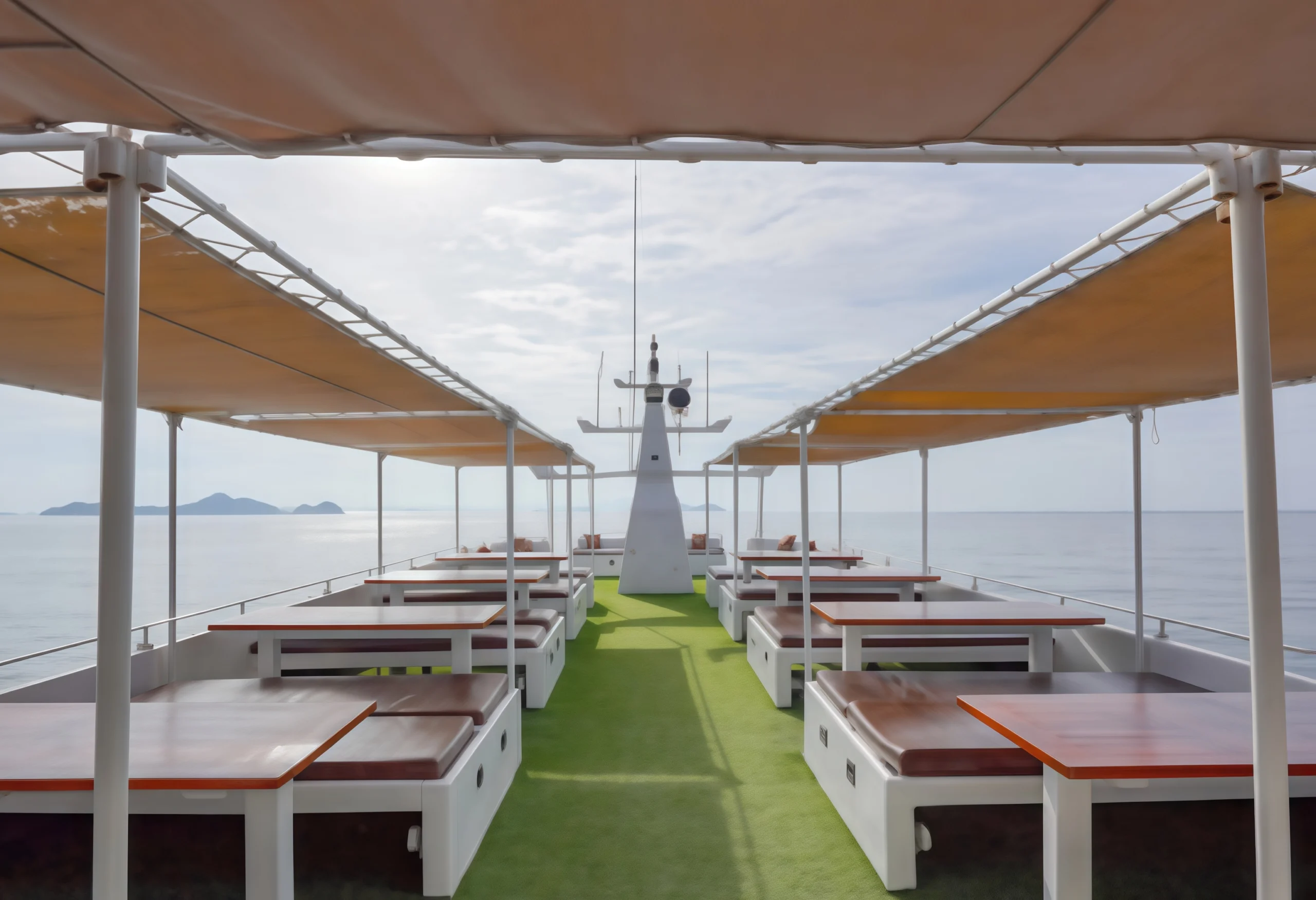 Ocean Angle has the best facilities to have a good time on board, there are sundeck to chill while sunbath, a dining area in front of the boat.