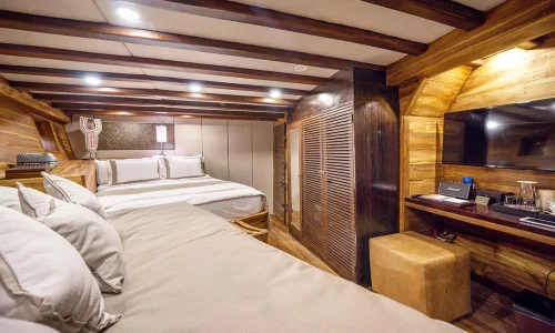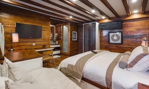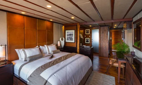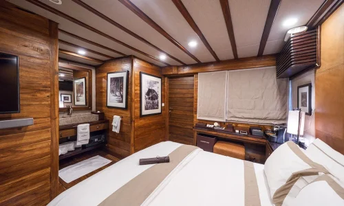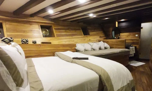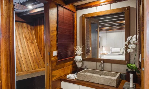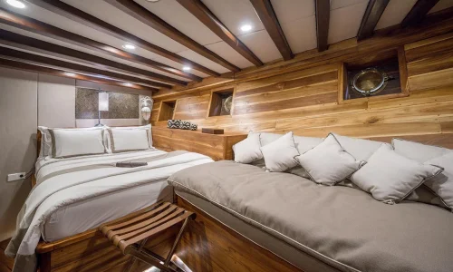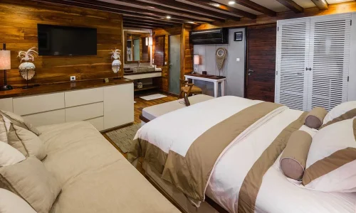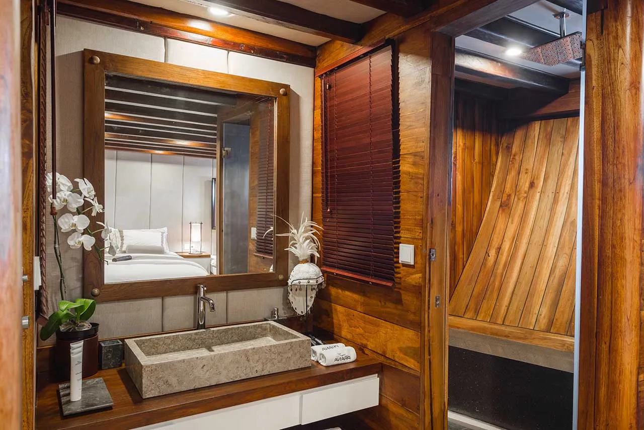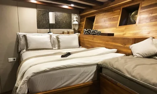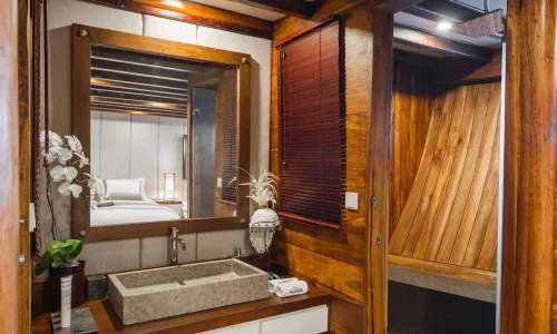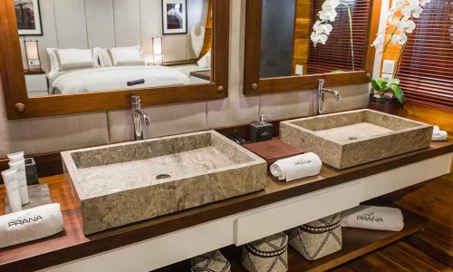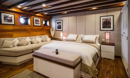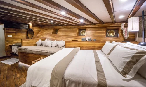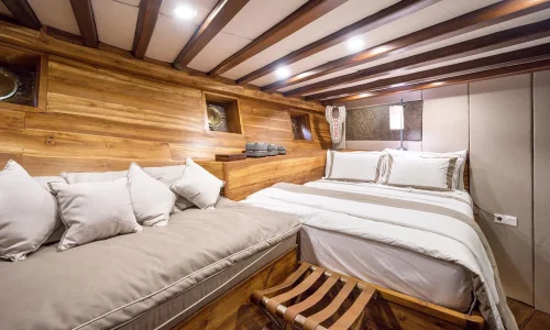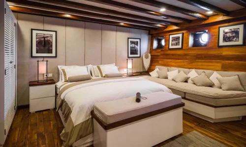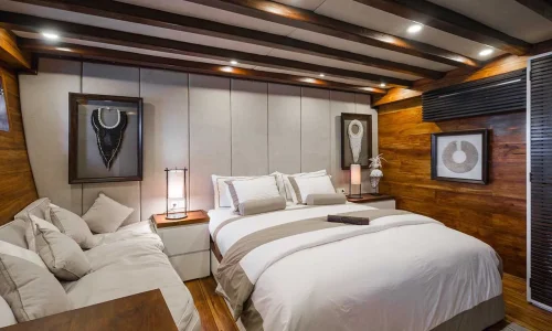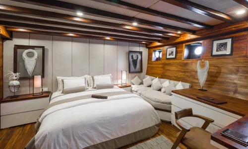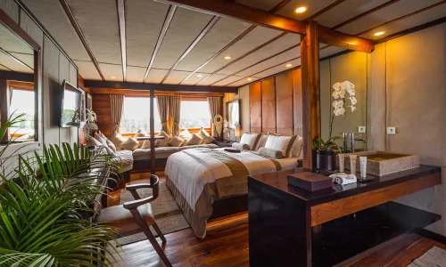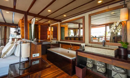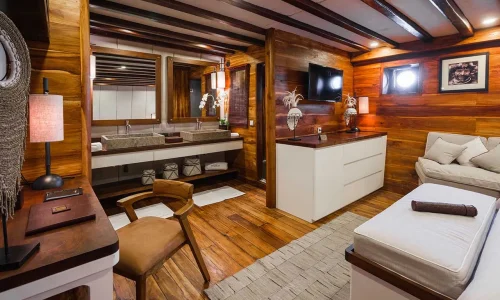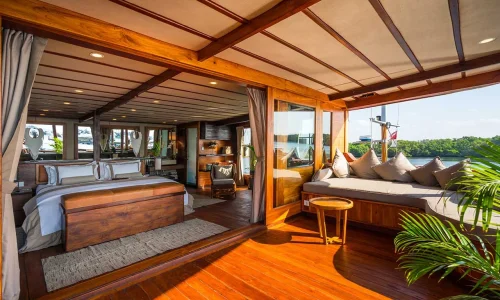 Prana by Atzaró is the largest and most luxurious Phinisi yacht in the world, offering an unparalleled sailing experience through the stunning seas and islands of Indonesia, including the breathtaking Komodo Island. This majestic 55-meter hand-crafted wooden yacht features nine luxurious suites spread across four decks, accommodating up to 18 guests. With two masts and seven sails, it provides a truly unique liveaboard experience, combining authenticity with modern luxury for the ultimate Komodo Island yacht charter.