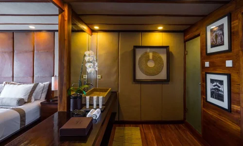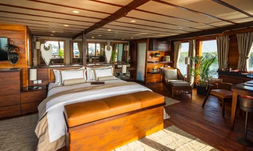 The luxury suites, day bed strewn decks, wide gangways, an air-conditioned indoor lounge and dining space with serviced bar. A rooftop yoga deck and evening cinema under the stars, wellness must-have Oasis Spa create a unique onboard experience with every luxury holiday need met beautifully.