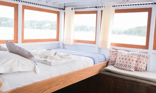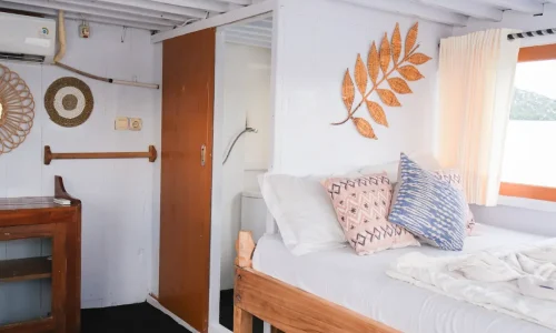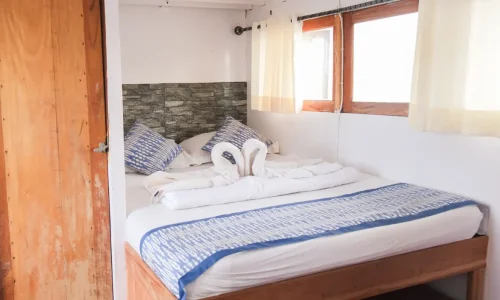 Explore the underwater wonders with our snorkeling equipment, providing an immersive experience without fins. Unleash your inner superstar with our onboard karaoke set, perfect for lively entertainment with friends and family. Relax in style on our spacious sundeck, complete with comfortable beanbags for sunbathing and stargazing. Our cruise features a semi-outdoor dining room for a unique dining experience amidst breathtaking views. With 5 cozy rooms offering private bathrooms, you can unwind comfortably after a day of exploration with Ramadhani Star Phinisi boat charter